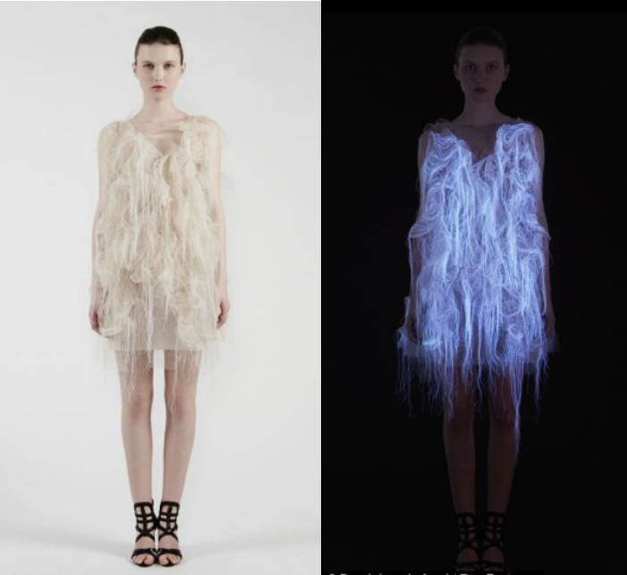 来自蒙特利尔的设计师Ying Gao把她的最新服装结合了眼球追踪技术,服装会觉察到人们的目光。 这件衣服用荧光线缝制,内部搭载了微小的眼球追踪电子设备。这种目光激活服装上缝的小马达能使衣物部位动起来,改变形状。在关灯的时候,这件衣服还能够发出冷光,成为一件像水母一样的艺术品。
